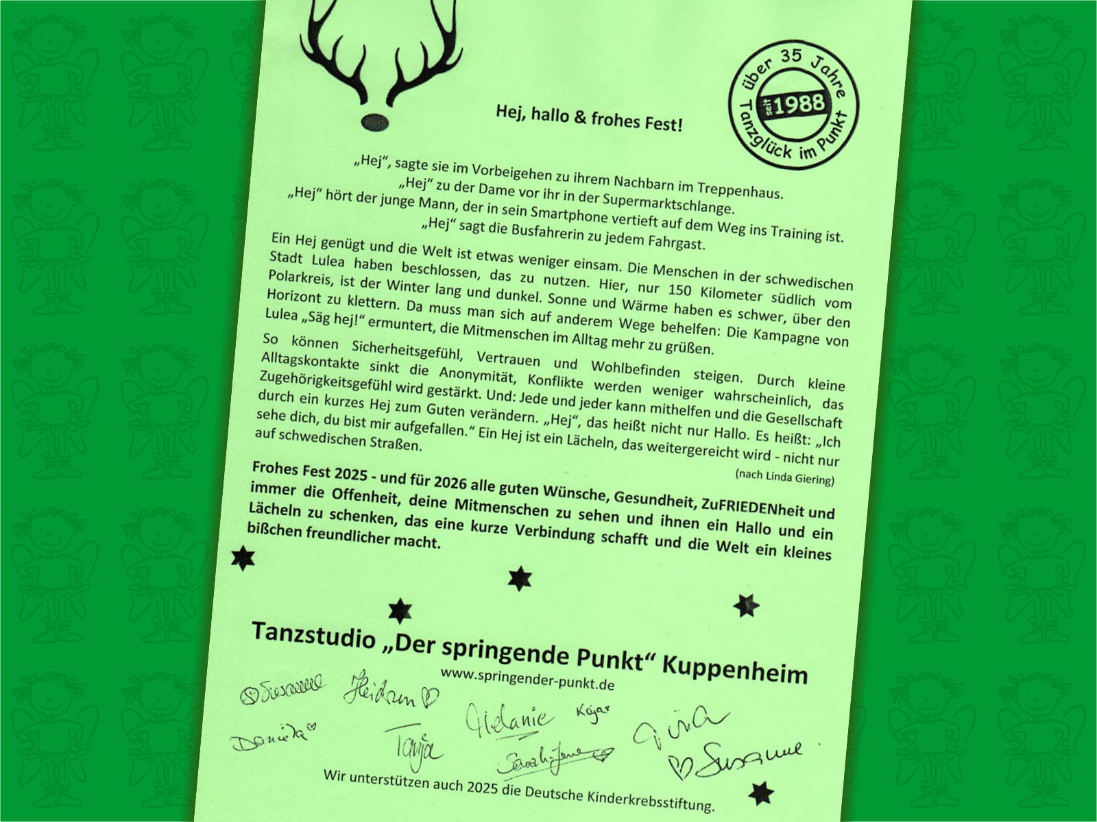 ein erstes herz­li­ches Mail-Hallo in diesem Jahr und - obwohl das Tanz­jahr bereits vor einer Weile gestar­tet ist - noch alles Gute für 2025!